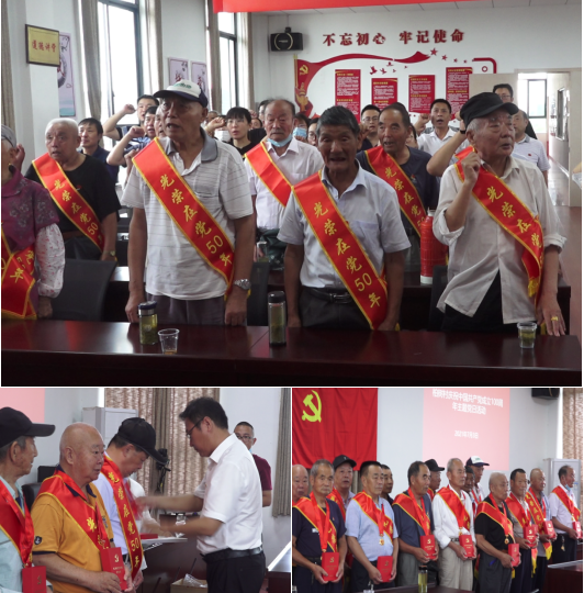 激昂悠揚的國歌響起,黨員們紛紛起立唱國歌,嘹亮的國歌聲中,主題黨日活動拉開帷幕。會上,村黨委書記陳家龍同志帶領大家重溫入黨誓詞,再次面對鮮紅的黨旗莊嚴宣誓,“我志愿加入中國共產(chǎn)黨......”鏗鏘有力的誓詞,直擊黨員們的內心,提醒他們不忘初心、牢記使命。隨后,村黨委為黨齡在50年以上的老黨員們舉行了“光榮在黨50年”紀念章頒發(fā)儀式,村黨委書記為老黨員佩戴了紀念章,并對他們多年來為組織作出的貢獻表示感謝。老黨員紛紛表示:“這是對我們的一種肯定,是一種贊揚,更是一種榮譽。”