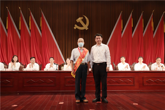 劉書記為老黨員代表頒發(fā)“光榮在黨50年”紀(jì)念章