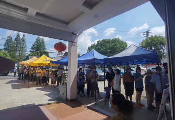 由于天氣炎熱,前來采樣的人數(shù)眾多,為了避免居民們中暑,網(wǎng)格員們用了一個小時間為暴曬在太陽底下的人們搭起了四個帳篷,為他們撐起一片“綠蔭”,以供他們遮陰避暑。同時,網(wǎng)格員們還拿來了一個個小扇子分發(fā)給每位排隊的居民,讓他們緩解炎熱。“網(wǎng)格員們真的是太貼心了,站在太陽底下很熱,還好有遮陰帳篷和小扇子。”現(xiàn)場核酸檢測的居民說道。
