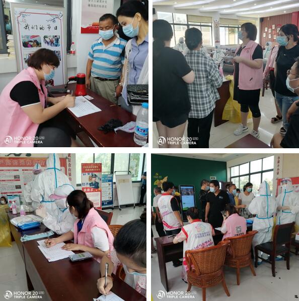 檢測現(xiàn)場,江寧區(qū)江寧街道天然村婦聯(lián)、巾幗志愿者積極參與疫情防控工作,履職盡責(zé),沖鋒在前,她們穿梭在人群當(dāng)中,引導(dǎo)群眾進(jìn)行有序排隊,幫助群眾登記信息,期間還積極解決群眾疑難問題,維持現(xiàn)場秩序。