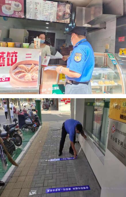 持續(xù)加大日常巡查力度,抓好對轄區(qū)內(nèi)沿街商鋪、大型商超、農(nóng)貿(mào)市場等重點(diǎn)區(qū)域的巡查管控,要求每日進(jìn)行不少于2次的消毒消殺和體溫測量,每次進(jìn)行不少于30分鐘的通風(fēng)換氣,做好信息記錄,對檢查中發(fā)現(xiàn)的防疫落實(shí)不到位的責(zé)令其立即整改到位。同時(shí)安排人員在沿街門店醒目位置張貼“請佩戴口罩入場”的溫馨提示,對不佩戴口罩者,拒絕入內(nèi);在商超入口、收銀臺等處張貼“一米線”標(biāo)識,提醒居民自覺保持安全距離排隊(duì),確保人員無近距離接觸,筑牢疫情防控安全防線。