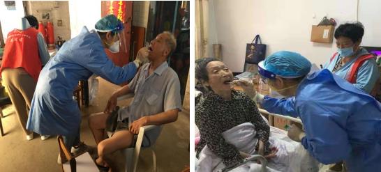 在陶吳社區(qū)有很多年齡大,臥病在床的老人,加上天氣炎熱,他們無法前往集中檢測點進行核酸檢測。針對這種情況,陶吳社區(qū)志愿者與負責核酸檢測采集工作的醫(yī)護人員組成專門的采樣工作小組,分頭前往行動不便的老人家中進行核酸檢測。先由志愿者將老人的信息進行登記,再由醫(yī)護人員對醫(yī)療物品進行消毒,之后進行咽喉取樣并囑咐老人們要做好個人防護。讓老人們不用出門就可以完成檢測,確保核酸檢測不漏一人。