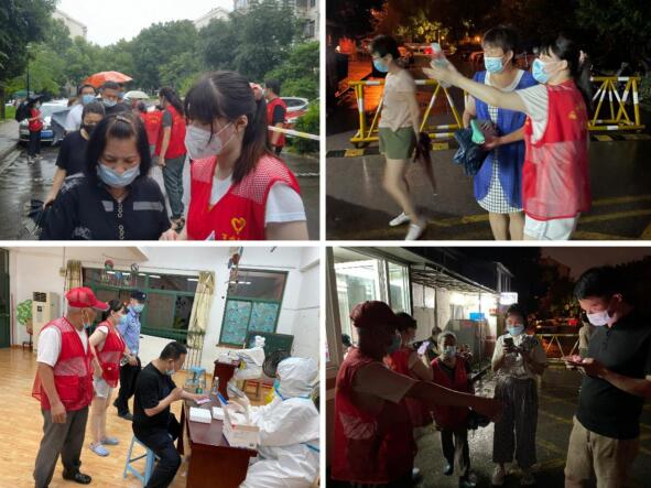 家住百水家園小區(qū)的老黨員周紹銀,今年78歲,黨齡51年,他是黨小組長、社區(qū)的平安志愿者、“博愛家園”志愿者。他一直熱心社區(qū)事務(wù),在他的感染下,他的愛人顧愛美也加入了社區(qū)志愿者隊(duì)伍,參與到社區(qū)的治安巡邏中。南京疫情爆發(fā)之后,周師傅第一個(gè)響應(yīng)社區(qū)號召,毅然加入社區(qū)疫情防控工作,在醫(yī)務(wù)工作者、社區(qū)工作人員徹夜為居民做核酸檢測時(shí),年近80歲的他也跟著一起維護(hù)秩序到深夜。第二輪檢測開始后,因?yàn)槿蝿?wù)緊,社區(qū)人手嚴(yán)重不足,周師傅還叫來了她的孫女顧瀅做志愿者。采集當(dāng)天,因?yàn)榕_風(fēng)影響,南京下起了暴雨,祖孫二人冒著雨,爺爺在現(xiàn)場維持秩序,孫女則幫助不會(huì)使用微信的老年人注冊核酸檢測采集碼,忙得渾身濕透卻毫無怨言。到了夜里,周師傅的愛人也在執(zhí)勤之余跑來幫忙。祖孫三人,用責(zé)任與擔(dān)當(dāng)守護(hù)著我們的生命,堅(jiān)守著我們的家園。三人穿著一樣的紅馬甲站在一起,形成了一道溫馨而亮麗的風(fēng)景線。