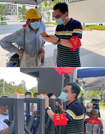 西花社區(qū)工作人員與棲發(fā)物業(yè)黨支部黨員志愿者于7月29日早5點(diǎn)30分就已在華僑城小學(xué)檢測點(diǎn)做好準(zhǔn)備。他們在第一時(shí)間下沉到核酸檢測點(diǎn),協(xié)助醫(yī)護(hù)人員登記信息、維持秩序、分流人員、設(shè)置綠色通道等,只為加速檢測進(jìn)程,減少居民等待時(shí)間。