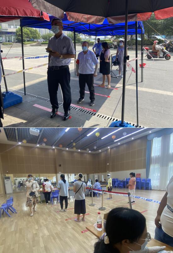 在志愿者與工作人員指引下,居民按照規(guī)劃好的排隊(duì)路線間隔一米有序排隊(duì)。因?yàn)樘鞖庋谉幔鐓^(qū)在室外排隊(duì)路線上安置了遮陽(yáng)棚,防止居民在排隊(duì)等候期間中暑。在社區(qū)兩委干部的積極帶動(dòng)下,社區(qū)工作人員和志愿者始終在烈日下堅(jiān)守在崗位上,為社區(qū)居民服務(wù),哪里有需要,哪里就有他們的身影。汗水打濕了他們的衣服,卻又在陽(yáng)光下曬干。