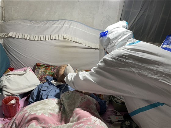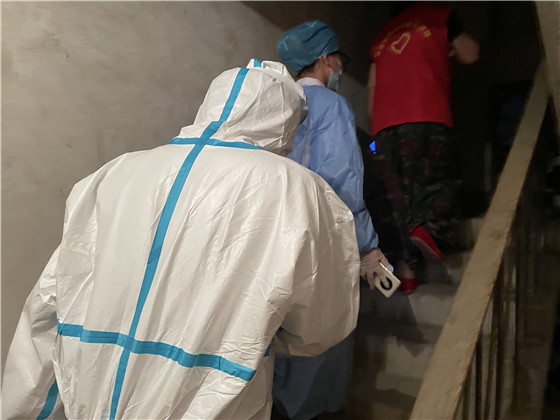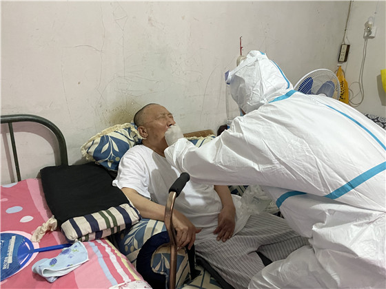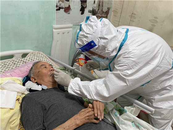 為做好檢測工作,棲霞社區(qū)精心組織、周密安排,提前逐一告知提醒這些老人們配合醫(yī)護(hù)人員進(jìn)行三次核酸檢測。社區(qū)轄區(qū)內(nèi)全是老舊小區(qū),沒有電梯,社區(qū)工作人員和醫(yī)護(hù)人員穿著隔離服穿梭在各小區(qū)中,厚重的衣服讓步伐變得沉重,采樣小組在社區(qū)工作人員的帶領(lǐng)下,堅(jiān)持爬樓三四十趟敲門入戶,登記信息,咽拭子采樣,醫(yī)護(hù)人員一邊耐心地安撫,一邊細(xì)心地指導(dǎo)老人張開嘴,小心、迅速地將棉簽伸進(jìn)老人咽部,盡量減少老人的不適感,讓老人們感到暖心、安心和放心,最后再叮囑家屬做好日常防護(hù)。“感謝你們能上門為我做核酸檢測,解決了我行動(dòng)不便的難題。謝謝你們!”做完檢測的老人連聲感謝。