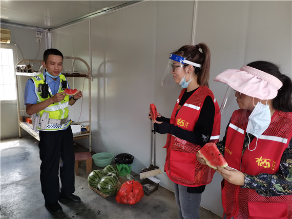 現(xiàn)場值守人員正在對進出車輛司乘人員進行體溫檢測,查看其健康碼并提示戴好口罩??谧钄嗟氖遣《?,連接的卻是愛心。“來來來,大家先停下來,吃點西瓜。”志愿者們熱情地向正在卡口值班值守的工作人員打著招呼,并讓他們吃點西瓜,消除暑熱。每到一個卡口處,社區(qū)黨委副書記林守香都會與堅守在卡口值守人員進行親切的交談,并叮囑一線人員在高溫下要注意休息,同時對他們堅守崗位、恪盡職守、舍小家顧大家、無私奉獻的精神表達崇高的敬意。“這西瓜吃起來比往年甜多了,這是一口有溫度的瓜。”老街卡口值守人員一邊“啃”著西瓜,一邊說道。