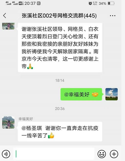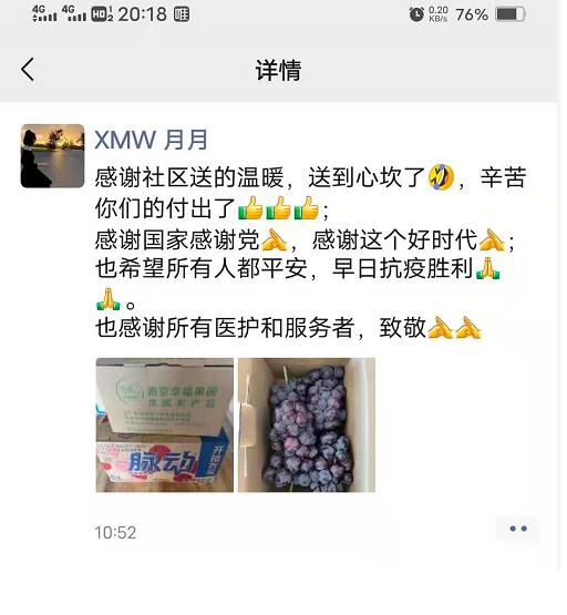 “感謝社區(qū)送的溫暖,送到心坎上了,辛苦你們的付出了……”在南京市江寧區(qū)谷里街道張溪社區(qū)一位居民的朋友圈寫著這樣一句話。自南京市出現(xiàn)新冠肺炎確診病例以后,按照有關(guān)防疫要求,需要對相關(guān)人員進行居家隔離,由于無法自主出門購買生活物資,該社區(qū)網(wǎng)格員楊圣琪便主動組成小分隊,幫助居家隔離人員代買生活用品以及發(fā)放一些生活物資。