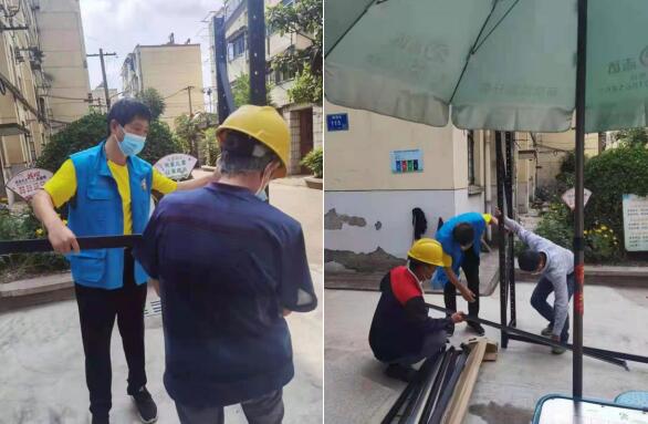 作為疫情防控的第一道防線,小區(qū)的出入口成為了保障社區(qū)安全的關(guān)鍵點(diǎn)。社區(qū)城市治理志愿者看到大量的快遞貨物堆積在地上,領(lǐng)取快遞時人員會少部分集中聚集,當(dāng)即在指定各個院片入口地點(diǎn)定制無接觸快遞專用貨架。通過多次進(jìn)行了實(shí)地觀測,對快遞人員的需求和每天的走貨量進(jìn)行了初步估算,選定好安裝“無接觸貨架”的區(qū)域、制定了貨架尺寸,在短短的一天時間內(nèi),“無接觸貨架”現(xiàn)身于小區(qū)??爝f員每天會把包裹按照區(qū)域放在架子上,社區(qū)值守工作人員定期對包裹進(jìn)行消毒處理。