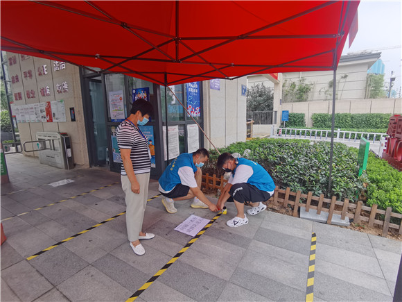 在檢查小區(qū)防疫措施落實(shí)情況時(shí),城市治理委員會(huì)公眾委員發(fā)現(xiàn)因小區(qū)大門口來回小推車和電動(dòng)車進(jìn)出比較頻繁,導(dǎo)致部分隔離帶有破損缺失,故組織城市治理志愿者,對(duì)小區(qū)大門口的“一米線”隔離帶進(jìn)行了修補(bǔ)更換。志愿者俯身把破損的更換下來,嚴(yán)格按照規(guī)定的間隔距離加貼上新的“一米線”。
