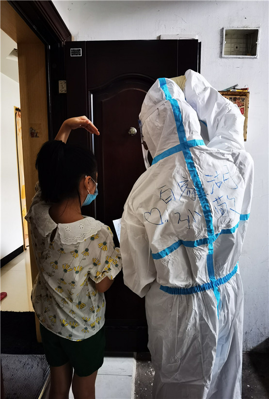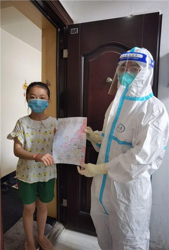 我畫的是白衣戰(zhàn)士們!”楊虞欣告訴我們“電視里,我看到很多穿著防護(hù)服的叔叔阿姨們,他們?nèi)杖找挂辜影嗉狱c為我們進(jìn)行核酸檢測,雖然我不知道他們防護(hù)服背后的模樣,但他們一定是最可親、可愛的人!我特別喜歡畫畫,我要用畫表達(dá)我的感謝,謝謝你們不懼危險,日夜奮戰(zhàn),守護(hù)一座城,守護(hù)一群人!”隨后向醫(yī)務(wù)人員豎起了大拇指。