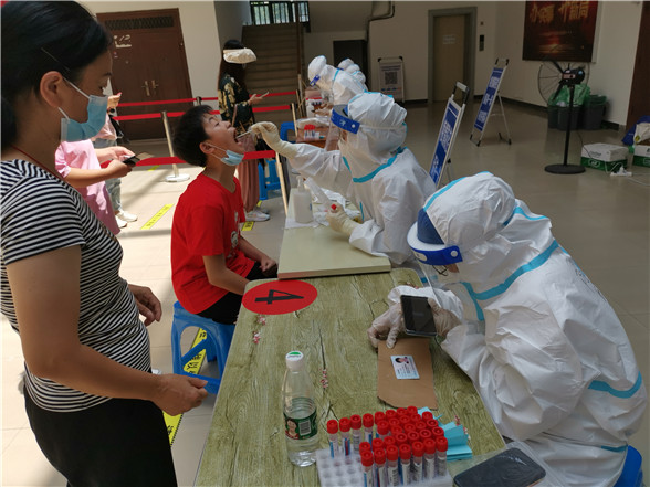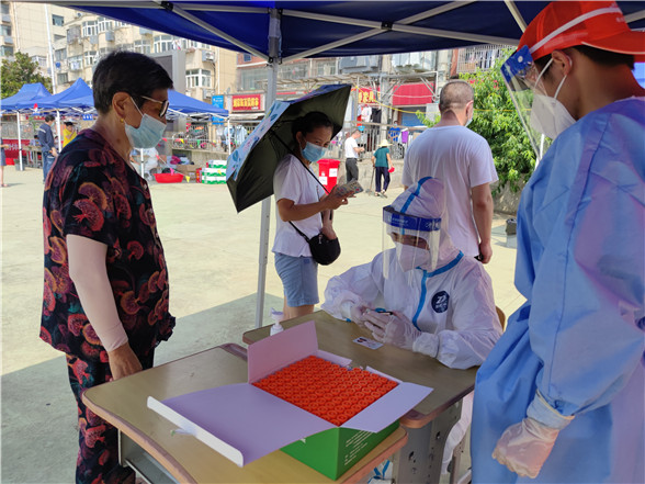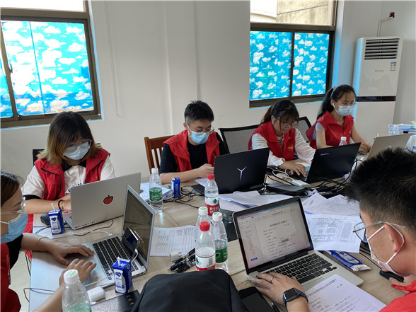 在烈日炙熱的核酸檢測(cè)現(xiàn)場(chǎng),志愿者高文慧、李佳欣、鐘欣雨三人頂著高溫酷暑一直堅(jiān)守在集中檢測(cè)點(diǎn)。錄入居民身份信息、引導(dǎo)居民有序排隊(duì)、協(xié)助解決群眾的疑難困惑……一輪又一輪的核酸檢測(cè)現(xiàn)場(chǎng)都有她們?nèi)说纳碛?。由于整天都需要穿上厚厚的防護(hù)服,加上天氣炎熱,一整天工作下來(lái),她們的衣服都被汗水浸濕。