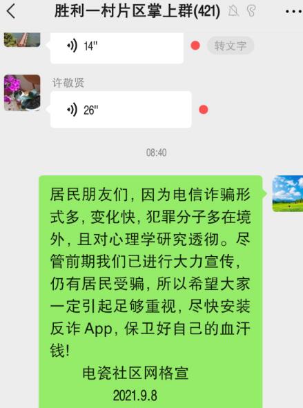“居民朋友們,因?yàn)殡娦旁p騙形式多,變化快,犯罪分子多在境外,且對(duì)心理學(xué)研究透徹,所以希望大家要引起足夠重視,盡快安裝反詐APP……”在居民微信群里,該社區(qū)的民警網(wǎng)格員們廣泛宣傳、多次強(qiáng)調(diào)反詐知識(shí),引起居民的警惕和注意。