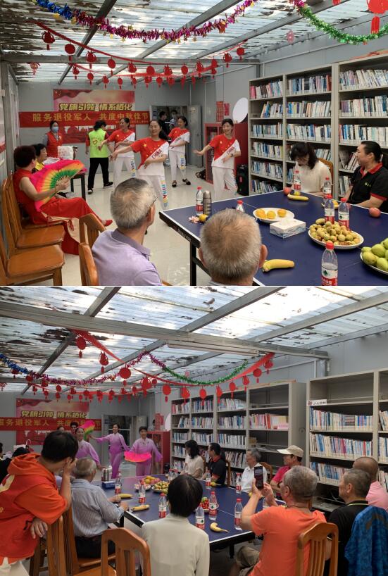 活動現(xiàn)場,退役軍人們圍坐在一起,品美食、看演出。穿上紅裙子、拿起粉扇子……在歡快的音樂伴奏下,志愿者們熱情地跳起舞蹈、唱起歌謠,讓氣氛瞬間達到高潮。退役軍人們則認真地欣賞著志愿者們的表演,還不自覺地跟著音樂哼唱起來。