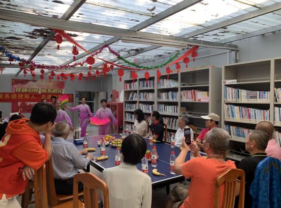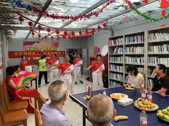 活動現(xiàn)場,退役老黨員們圍坐在一起,品美食、看演出。穿上紅裙子、拿起粉扇子……在歡快的音樂伴奏下,志愿者們熱情地跳起舞蹈、唱起歌謠,讓氣氛瞬間達(dá)到高潮。退役老黨員們則認(rèn)真地欣賞著志愿者們的表演,還不自覺地跟著音樂哼唱起來。