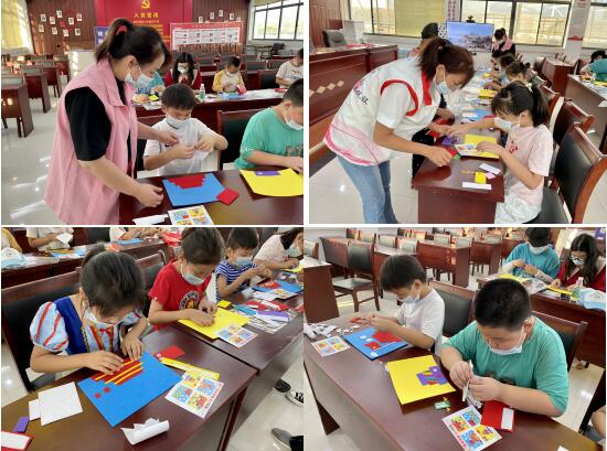 鮮艷的五星紅旗、彩色的多層蛋糕、莊嚴(yán)肅穆的天安門廣場、展翅飛翔的和平鴿……孩子們親自動手,在工作人員的指導(dǎo)下,在彩紙上貼上一個個貼畫,用自己的方式為祖國母親慶生。