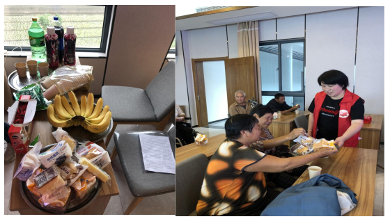 尊老敬老是中華民族的傳統(tǒng)美德,能夠?qū)⒆约旱囊环輴坌姆瞰I(xiàn)給這里的殘疾老人們,志愿者們也非常開心,秉承著“尊老敬老”的原則,我們特地在現(xiàn)場(chǎng)擺放了一些水果、零食和飲品,給予老人們享用。考慮到殘疾老人們行動(dòng)不便,社區(qū)殘疾人之家工作人員及志愿者一一將準(zhǔn)備好的食物分發(fā)到老人手中。