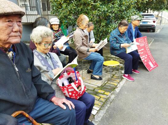 當天,志愿者們邀請9幢的中老年人帶著自己喜愛的書籍來到活動現(xiàn)場。大家圍坐在一起,介紹自己推薦的書籍以及推薦理由,并與其他人共同分享在書中的收獲和感想,講一講自己在閱讀期間發(fā)生的趣事,大家在觀點的碰撞與交流中,迸發(fā)思想的火花。老年人們紛紛表示,之前一直只是在家里看電視、玩手機,偶爾出去打打牌,現(xiàn)在能夠和其他人一起讀書交流,感覺重新回到了年輕的時候?,F(xiàn)場,志愿者還邀請參加活動的老年人掃二維碼聽紅色經(jīng)典,方便平時視力不好的老年人通過聽書的方式“閱讀”,獲取相關(guān)的知識,傳承紅色基因。