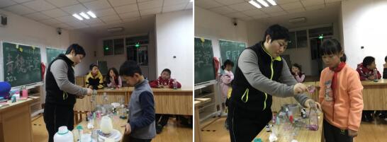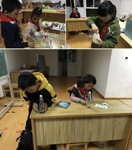 活動中,老師帶著同學(xué)們進(jìn)行了科學(xué)實驗,教會他們制作一個星辰大海主題的夢想瓶。大家先選擇自己夢想瓶中的配飾:海螺、彩石、小星星、小珍珠、小花朵等,再挑選自己的主題顏色,將AB膠混合攪拌,注入瓶內(nèi),一個彩色的夢想瓶就制作完成了。拿著承載星辰大海的夢想的玻璃瓶,同學(xué)們的心中充盈著成就感、新鮮感和對未來滿滿的期待。