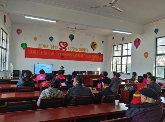 11月25日是聯(lián)合國(guó)確立的“國(guó)際消除針對(duì)婦女暴力日”,又被稱(chēng)為“國(guó)際反家暴日”,當(dāng)天,棲霞區(qū)棲霞街道江南廠社區(qū)婦聯(lián)組織開(kāi)展法制主題講座,以家庭平安推進(jìn)文明社區(qū)建設(shè)。