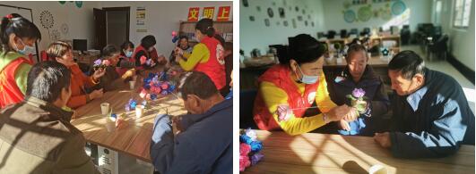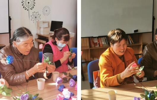 首先,志愿者把殘疾人分成了兩組,一組穿串珠,另一組則學(xué)習(xí)制作絲帶玫瑰花。第一組手工老師示范了如何將珠子穿進(jìn)繩子里,如何區(qū)分珠子顏色以及如何打結(jié);另一組手工老師則教殘疾人怎樣把絲帶玫瑰花瓣粘好以及如何把葉子和花朵組裝在一起。兩組分工有序,各自忙碌著。