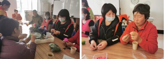 “這個珠子穿在哪?”,“這里哦~”;“這里我不會做了!”,“沒關(guān)系,慢慢來,我教你。”這是當(dāng)天最常聽到的一些話,手工老師和志愿者們手把手耐心的教每一位殘疾人如何制作手工產(chǎn)品,并把制作技巧一一傳達(dá)到位,使得殘疾人在指導(dǎo)下有序進(jìn)行輔助性就業(yè)。