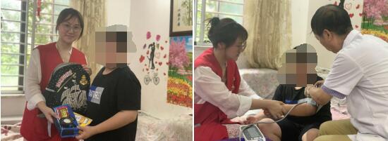 家庭醫(yī)生進(jìn)社區(qū),體檢服務(wù)進(jìn)家庭。翠林山莊社區(qū)兒童主任和堯化街道衛(wèi)生服務(wù)中心的家庭醫(yī)生帶著血壓儀等醫(yī)療器械和所需的尿墊尿不濕、書包文具等物品來(lái)到兩名困境兒童劉瀚瀚(化名)和孫小小(化名)家中。在困境兒童的家中,家庭醫(yī)生借助專業(yè)醫(yī)療器械對(duì)于困境兒童的身體狀況進(jìn)行全面檢查,讓無(wú)法出行的困境兒童早了解自身的身體狀況,做到早發(fā)現(xiàn)、早診斷、早治療。同時(shí)他們?yōu)槔Ь硟和腿チ藭?、學(xué)習(xí)用品,并詳細(xì)了解了孩子的學(xué)習(xí)生活情況及實(shí)際困難,鼓勵(lì)他們樹立信心,自強(qiáng)不息,勇敢面對(duì)困難,將來(lái)成為對(duì)社會(huì)有用的人。社區(qū)不僅對(duì)困境家庭困境兒童進(jìn)行物質(zhì)上的幫助,更重要的是對(duì)困境兒童和這個(gè)家庭進(jìn)行精神上的關(guān)懷,讓他們感受到社區(qū)大家庭的關(guān)愛(ài)與溫暖。