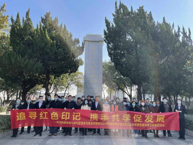 12月4日,江寧區(qū)秣陵街道牛首社區(qū)黨委和共建單位紫金農(nóng)商銀行江寧開發(fā)區(qū)支行攜手,共同開展“追尋紅色印記 攜手共學(xué)促發(fā)展”紅色教育暨黨建共建主題黨日活動,前往龍都烈士陵園參觀學(xué)習(xí)。