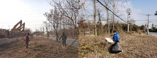 當(dāng)天,面對(duì)茂密枯萎的雜草,東陽(yáng)社區(qū)工作人員和工會(huì)志愿者踐行雷鋒精神,積極參與,自帶割草機(jī)、鐮刀、掃帚等工具,共分成3組一起互相協(xié)作。大家紛紛擼起袖子一起行動(dòng),有的除雜草、有的撿垃圾、有的清掃路面,你前我后,一個(gè)跟著一個(gè)的腳步走,不放過(guò)任何一個(gè)死角。冬天的嚴(yán)寒沒(méi)有冷卻大家集體行動(dòng)的熱情,社區(qū)工作人員和志愿者們干的熱火朝天、汗流浹背,鞋、褲腿上都粘上了厚厚的泥土,但每個(gè)人都毫無(wú)怨言。