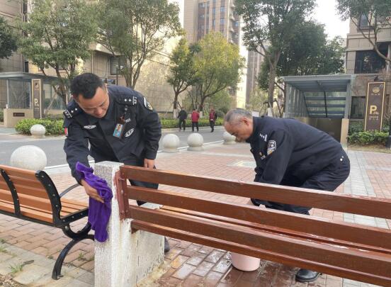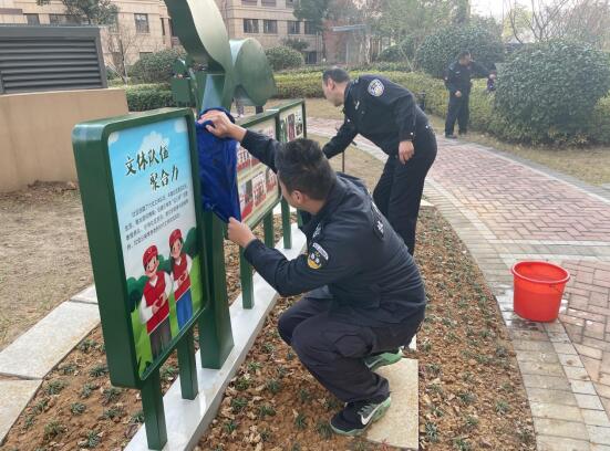 俗話說(shuō)“火車跑得快,全靠車頭帶”,方所長(zhǎng)發(fā)揮領(lǐng)導(dǎo)干部模范作用帶頭干活,民警們更加有了干勁。只見(jiàn)身戴黨徽的他們有的一會(huì)手臂高舉一會(huì)俯身蹲下,努力擦拭標(biāo)識(shí)頂部和底座的頑強(qiáng)的污漬;有的一手扶著牌子一手輕輕擦拭黨建宣傳板上的灰塵;有的彎腰低頭,反復(fù)擦拭休閑椅、石桌石凳、寵物紙便箱上的衛(wèi)生死角;有的拎著水桶為同事搓、換抹布。大家各司其職,互相配合,認(rèn)真負(fù)責(zé)、積極干好衛(wèi)生打掃工作,絕不放過(guò)任何一個(gè)細(xì)節(jié),不留一個(gè)衛(wèi)生死角。