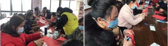 歡樂的游戲環(huán)節(jié)結(jié)束后,志愿者和居民們圍坐在桌邊,領(lǐng)取剪紙材料和工具。大家埋頭剪紙,用靈巧的雙手將原本平平無奇的紙張上剪出精美的圖案。隨后,居民們還將剪出的窗花粘貼在底板上,變成了一個個喜慶的掛飾。