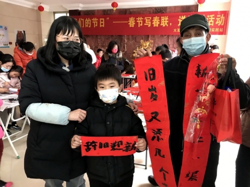 寫春聯(lián)活動結(jié)束后,小學(xué)童獲得社區(qū)贈送新年紅燈籠虎仔小掛件歡心鼓舞,手捧著他們各自新作墨寶紛紛要求合影拍照,家長們笑逐顏開,相互交流。