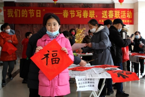 娃娃展紙研墨寫春聯(lián)“福”進社區(qū)迎春來