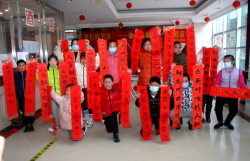 志愿者老師精湛的書法技藝演示和書法寫作規(guī)范要求,吸引孩子們書法感染力,他們對每一個字體逐字一筆一畫,有模有樣的進行書法寫作,一幅幅春聯(lián)獲得成就感自豪感,得到志愿者老師的肯定,家長們津津樂道,孩子們沉浸在一片歡樂興致之中。