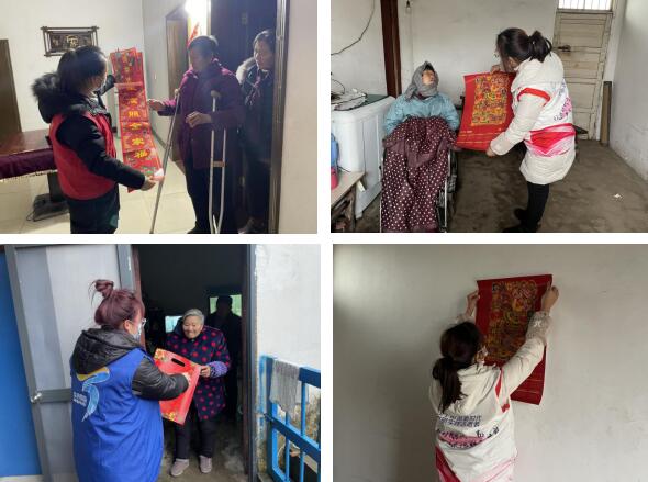上午一大早,兩委成員、志愿者和網格員拿著福字和米油上門拜訪村里困難人群。“一拿到春聯(lián),年的味道就顯現出來了,我腿腳不方便,你們能幫我張貼嗎”老人佝僂著身子,摩挲著凹凸的紅色福袋,充滿期待的對志愿者說。志愿者二話不說把春聯(lián)和福字板正的貼在門上。