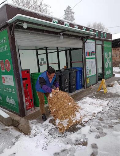社區(qū)指導(dǎo)員一邊念叨著“瑞雪兆豐年”,一邊在垃圾分類站前掃雪,只見她先用鏟子極力推去門口的積雪,繼而撣落草甸上的雪塊,又將草甸一一鋪平,擺上小心防滑的提示牌,等待居民前來扔垃圾。由于老小區(qū)的緣故,居民多是老年人,防凍防滑最是重要,面對前來投放垃圾的居民,垃圾分類指導(dǎo)員熱情地與他們道了新年好,并耐心叮囑他們要小心地滑,慢慢走,盡量不要出門。