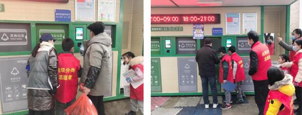 紙上得來終覺淺,絕知此事要躬行,課程結(jié)束后,由家長帶領自己的孩子進行廂房前值守,小志愿者們身穿志愿者紅馬甲,向投放垃圾的居民們發(fā)放了垃圾分類的宣傳材料,并引導居民養(yǎng)成良好的定時投放習慣,在廂房開放時間將分類好的垃圾投入相應的桶內(nèi),居民都非常配合孩子們,也對他們的行為給予鼓勵和贊揚。得到了爺爺奶奶叔叔阿姨們的肯定和認可,孩子們也更加積極主動地上前和居民進行交流。