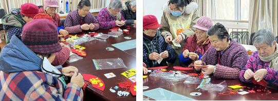 活動現(xiàn)場,志愿者為老人們分發(fā)了手工掛飾制作材料包,有“吉祥如意”、“招財進寶”、“福”等多個類型,并詳細地講解了制作方法,在志愿者們的指導和幫助下,老人們認真地動手制作起來,通過撕、粘、貼、串等手法,制作完成了一件件洋溢著歡樂祥和的迎春氣息的作品,現(xiàn)場其樂融融、笑聲不斷。