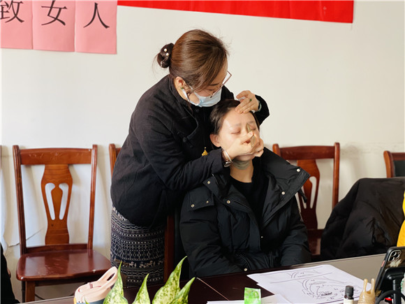 活動正式進入主題,主講老師通過“內(nèi)在女神祈禱”和“外在養(yǎng)護分享”兩個環(huán)節(jié)的互動和分享。“我內(nèi)在的女神,我以我的性別為榮”、“我內(nèi)在的女神,我以我的情緒為榮”、“我內(nèi)在的女神,我以我的身體為榮”......養(yǎng)護環(huán)節(jié),老師教授現(xiàn)場女性如何使用撥筋棒進行日常面部養(yǎng)護。