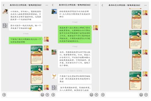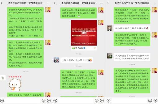 實(shí)踐站志愿者先與家長(zhǎng)們分享一段《中華人民共和國(guó)家庭教育促進(jìn)法》PPT視頻,從家庭責(zé)任、社會(huì)協(xié)同、國(guó)家支持、法律責(zé)任四個(gè)方面進(jìn)行解讀。學(xué)習(xí)法則的重要意義、地位作用和核心內(nèi)容,引導(dǎo)家長(zhǎng)樹(shù)立科學(xué)教育觀念,切實(shí)履行家庭教育主體責(zé)任。同時(shí)引導(dǎo)家長(zhǎng)理解和支持學(xué)校工作,更加關(guān)注孩子健康成長(zhǎng),使素質(zhì)教育的根本理念、立德樹(shù)人的根本任務(wù)在家庭中得到落實(shí)。通過(guò)學(xué)習(xí)家長(zhǎng)們也紛紛表達(dá)自己的想法,認(rèn)為好的家庭教育是孩子成長(zhǎng)的啟明燈,支持家庭教育促進(jìn)法。最后,志愿者再次拋出7個(gè)問(wèn)題:家庭教育促進(jìn)法的目的是什么?什么是“家庭教育”?“家庭教育”的總體要求?家長(zhǎng)必須做什么和不能做什么?法律什么時(shí)候介入?家長(zhǎng)的義務(wù)是什么?家庭教育的主要方式是什么?和家長(zhǎng)們分享答案解析一起溫故而知新。