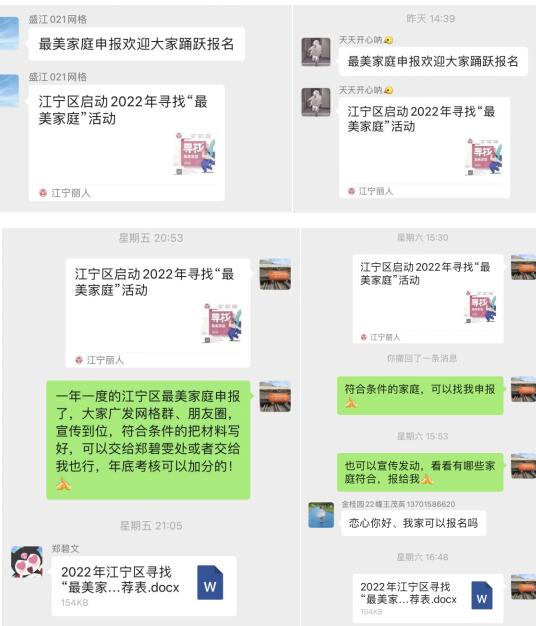 為了讓更多家庭知曉并主動參與“最美家庭”活動,盛江社區(qū)婦聯(lián)執(zhí)委和網(wǎng)格員通過線上線下的方式加大宣傳力度,鼓勵居民通過自薦和推薦的方式積極參與尋找“最美家庭”的活動,主動參與社區(qū)文化建設(shè),營造和諧社區(qū)氛圍。