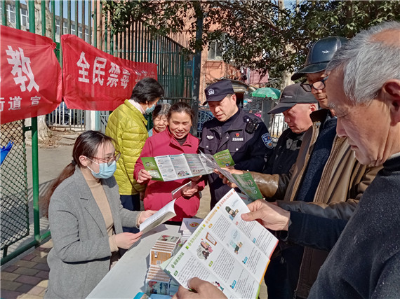 活動現(xiàn)場,張律師就高空拋物、財產(chǎn)糾紛、房屋漏水賠償?shù)葹榍皝碜稍兊木用褚灰唤獯稹蚧沙鏊ňW(wǎng)格員趙警官,向在場的居民發(fā)放防詐宣傳冊并告知居民謹防上當受騙。網(wǎng)格長、志愿者們則向居民現(xiàn)場講解禁毒、反邪、防詐等相關知識并發(fā)放法制宣傳冊及環(huán)保宣傳袋,以此提高居民群眾的防范意識、法制意識。