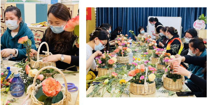 活動(dòng)現(xiàn)場(chǎng),特邀的花藝?yán)蠋熛虼蠹医榻B了本次活動(dòng)所用花材有:橙芭比,洋牡丹,火靈鳥,香檳,蘇醒,洋甘菊,滿天星,尤加利葉子,多頭康乃馨,小雛菊,隨后介紹不同花材蘊(yùn)含的獨(dú)特含義與真切祝福。從剪枝裁葉到插枝技巧,從精心造型到色彩搭配,大家在一修一剪之間,完成了各自匠心獨(dú)運(yùn)又精彩紛呈的藝術(shù)創(chuàng)作。眾多精美作品在歡聲笑語(yǔ)的氛圍與沁人心脾的芬芳中一一呈現(xiàn),將本次活動(dòng)氣氛推向高潮。