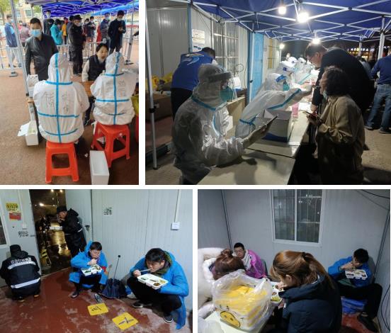病毒不等人,核酸檢測(cè)工作向來(lái)是晝夜不停歇的,醫(yī)護(hù)人員和志愿者們每天在城市還未徹底蘇醒之前,就已經(jīng)在核酸檢測(cè)點(diǎn)做好了一切準(zhǔn)備工作。陸陸續(xù)續(xù)有居民們來(lái)到現(xiàn)場(chǎng),戴口罩、隔一米線、打開(kāi)身份碼、摘下口罩、采集樣本、再戴上口罩離開(kāi)現(xiàn)場(chǎng),一切都井然有序、不慌不忙。但醫(yī)護(hù)人員們手上從來(lái)沒(méi)停過(guò),不斷重復(fù)著打開(kāi)采樣和用消毒液洗手的動(dòng)作,即使在那手套之下,他們的手指已經(jīng)因?yàn)槭畮讉€(gè)小時(shí)的重復(fù)而僵硬,對(duì)待居民們卻依然溫柔耐心。吃飯、睡覺(jué)、上廁所,這些人類的本能需求在他們這里似乎也被抑制著,不過(guò)是偷出一些時(shí)間,蹲在地上扒幾口飯,直到天幕黑沉,醫(yī)護(hù)人員和志愿者們才揉一揉發(fā)酸的手臂,獲取片刻休息,又繼續(xù)投入到其他工作之中。