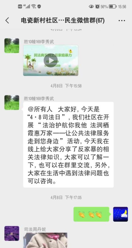 為了進(jìn)一步推動(dòng)社區(qū)平安法治建設(shè),從源頭上預(yù)防和制止家庭暴力,增強(qiáng)轄區(qū)內(nèi)廣大婦女同胞的反家暴意識(shí),4.8司法日,南京市棲霞區(qū)燕子磯街道電瓷社區(qū)法律顧問在微信群開展線上普法教育,將反家暴知識(shí)“送上家門口”。