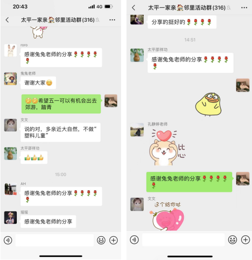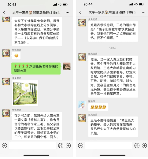 本次活動采取“線上”形式,引導居民群眾、特別是父母兒童自行開展閱讀,通過微信群、朋友圈分享閱讀內容和閱讀心得,并推薦好書好章節(jié)。活動中,兔兔老師分享臺灣著名作家三毛所寫的“塑料兒童”這一小故事,并分享了一本超有料的科普新童圖畫書《去郊游》。居民朋友們積極參與,掀起家庭閱讀的熱潮。