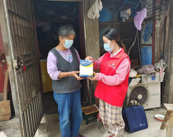 志愿者與社區(qū)網(wǎng)格員來到一戶特扶老人家中,老人年事已高、腿腳不便,外出采購物資困難。深入了解相關(guān)情況后,社區(qū)工作人員將口罩等防疫物資送至老人家中,以解燃眉之急,還送去牛奶等營養(yǎng)品,補(bǔ)充日常所需。面對社區(qū)此舉,老人表示萬分感動,連聲道謝。臨行前,志愿者還不忘仔細(xì)叮囑老人疫情防控期間少出門,注意身體。