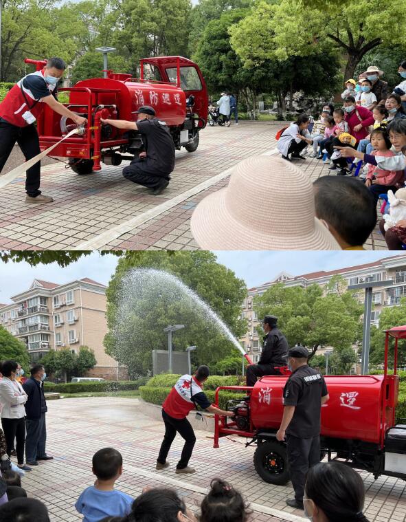 東山街道中前社區(qū)的網(wǎng)格員和銀城物業(yè)給小朋友和家長們帶來了干貨滿滿的消防安全知識,現(xiàn)場不僅教學(xué)安全逃生動作,還演示滅火器的實際使用方法。在看到真實的滅火場景時,小朋友們都非常震撼,看到社區(qū)微型的消防車高壓水槍噴射出水注時,抑制不住的新奇和興奮。