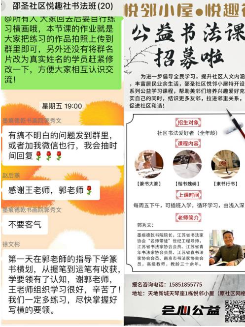 為豐富和活躍社區(qū)居民的精神文化生活,讓居民感受中國(guó)的傳統(tǒng)文化,近日,南京市江寧區(qū)東山街道邵圣社區(qū)聯(lián)合南京市會(huì)心社會(huì)工作服務(wù)中心開設(shè)悅?cè)ど鐣ò啵缮鐓^(qū)志愿者書法家郭秀文老師為大家授課,報(bào)名的居民從30歲到70歲,老中青三代學(xué)員匯聚一堂,共同感受書法的魅力。