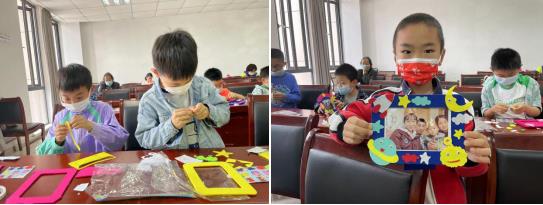 活動(dòng)最后,志愿者老師帶著孩子手工制作相框,孩子們和家長(zhǎng)一起動(dòng)手,不一會(huì)兒漂亮的相框就制作完成,家長(zhǎng)與孩子們一同并把帶來(lái)的全家福裝進(jìn)相框,孩子們高興地拿著自己的作品相互分享欣賞。